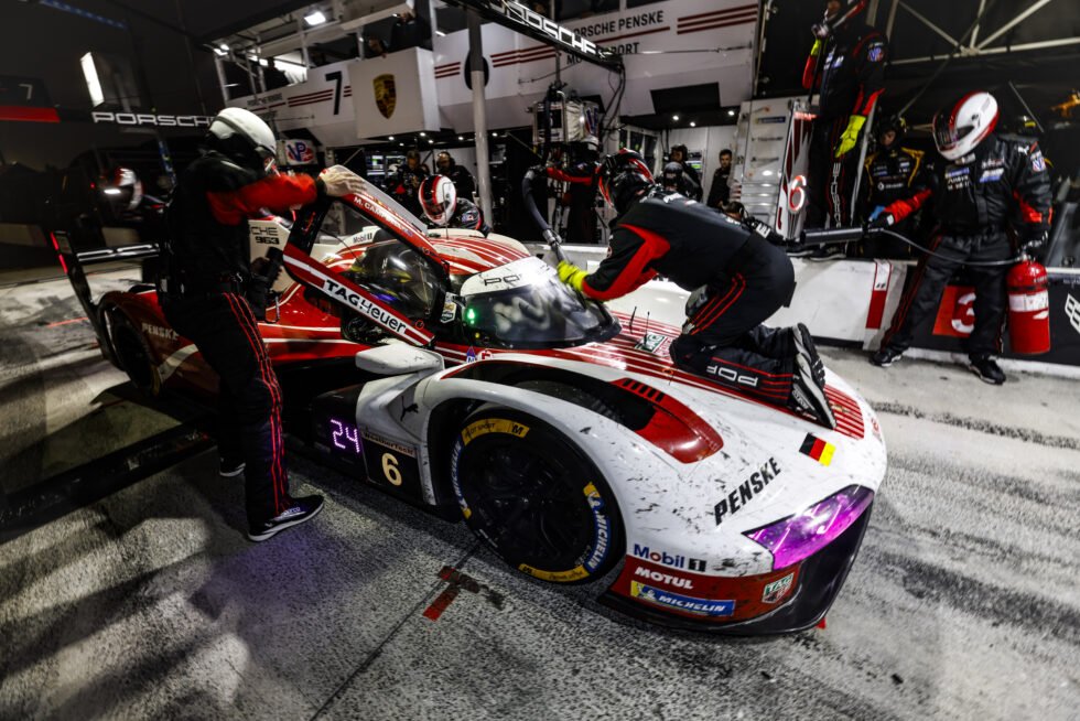 DAYTONA BEACH, FLORIDA – JANUARY 24: #6: Porsche Penske Motorsport, Porsche 963, GTP: Laurens Vanthoor, Kevin Estre, Matt Campbell, pit stop during the IMSA WeatherTech SportsCar Championship Roar Before The 24 at Daytona International Speedway on January 24, 2026 in Daytona Beach, Florida. (Photo by Michael L. Levitt/Lumen via Getty Images)